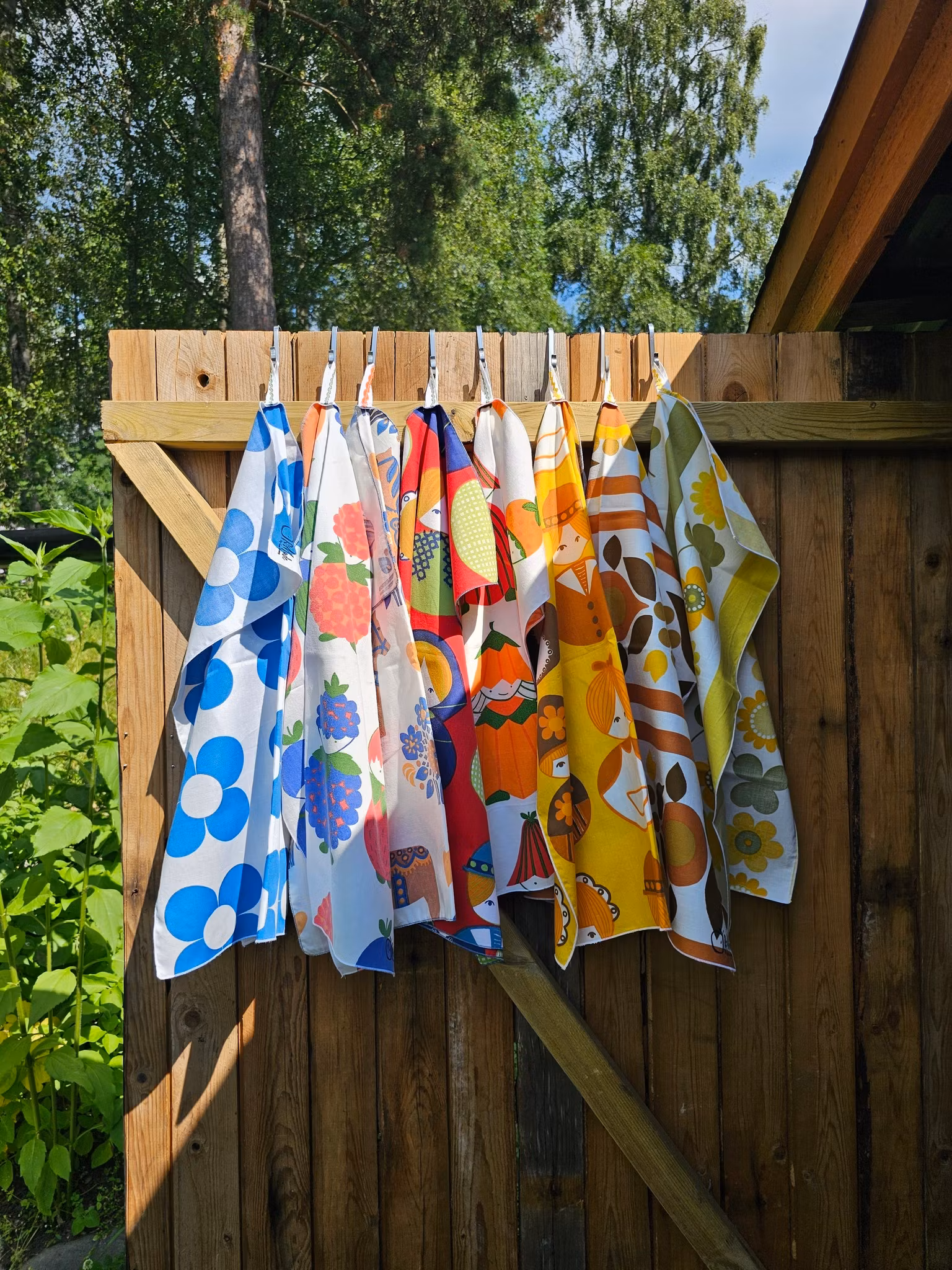 Men det slutar inte där. Denna kökshandduk är också en fantastisk dekoration för ditt kök. Tillverkad av återbrukade textilier, ger den en färgglad och hållbar touch till ditt hem. Varje handduk är unik och bär på en historia av återbruk och kreativitet.