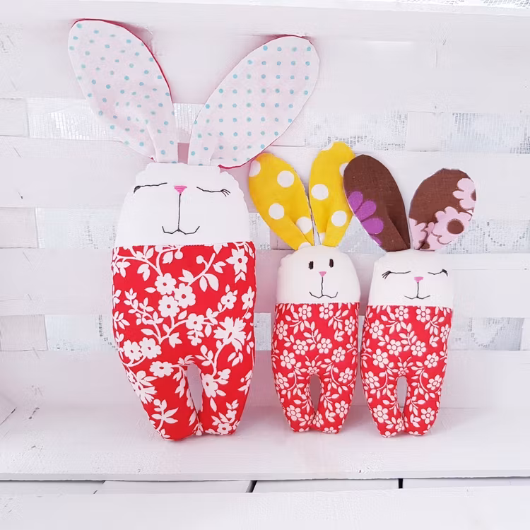 Varje kanin är unik! Vissa finns endast i ett exemplar och är tvåfärgade med olika tyg på fram- och baksida. Öronen har också olika färger, vilket gör varje kanin till ett unikt konstverk.