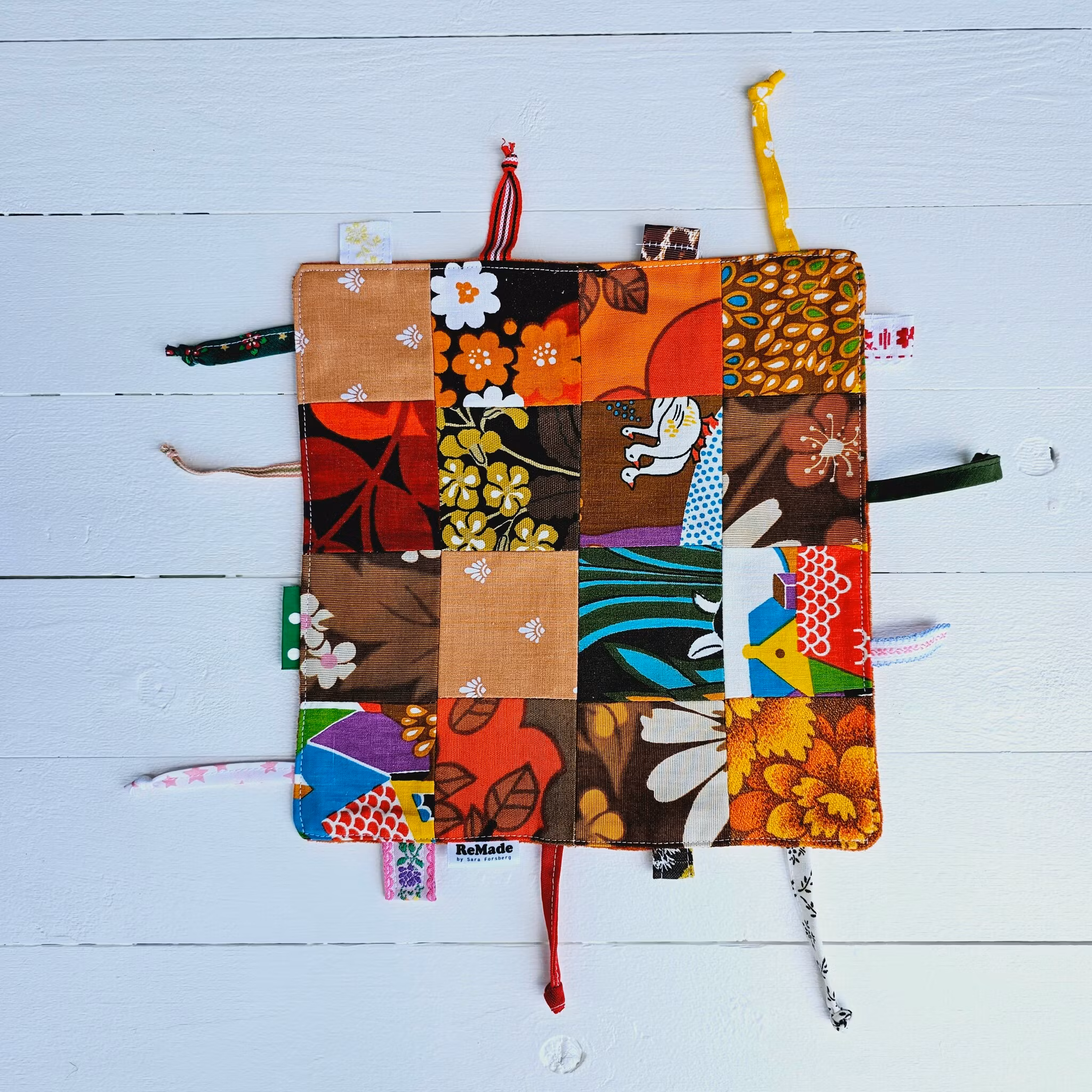 Denna snuttefilt är inte bara mjuk och gosig, utan erbjuder också en rad aktiviteter för små händer att utforska. Med pill-lappar och band med knutar blir varje stund ett äventyr, där ditt barn kan känna, dra och upptäcka nya texturer.