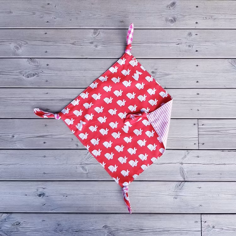 En härligt färgglad snuttefilt med knutar i alla hörnen!