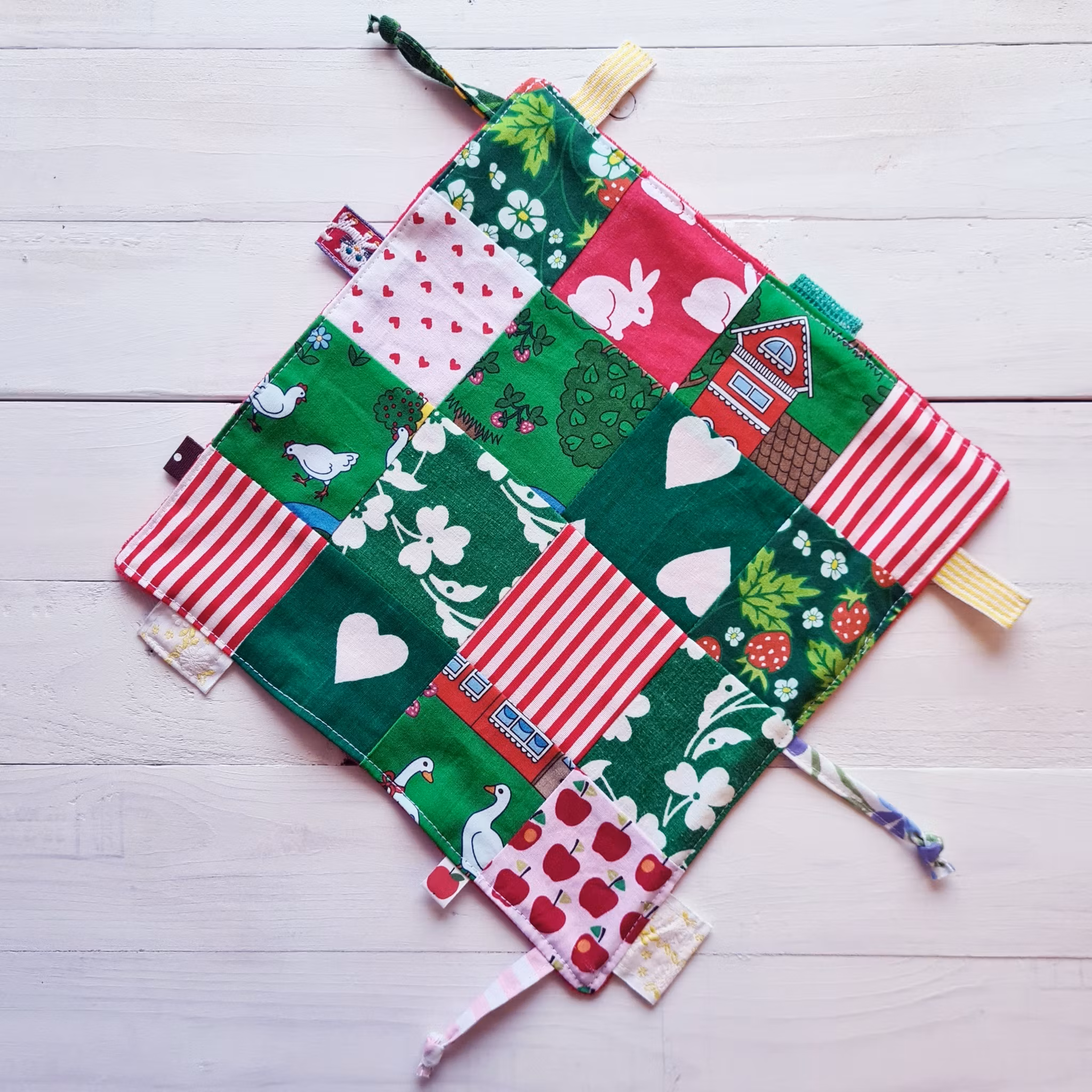 Eftersom vi använder småbitar från vår övriga produktion kan motiv och mönster på framsidan variera något. Detta betyder att varje snuttefilt är unik, precis som ditt barn.