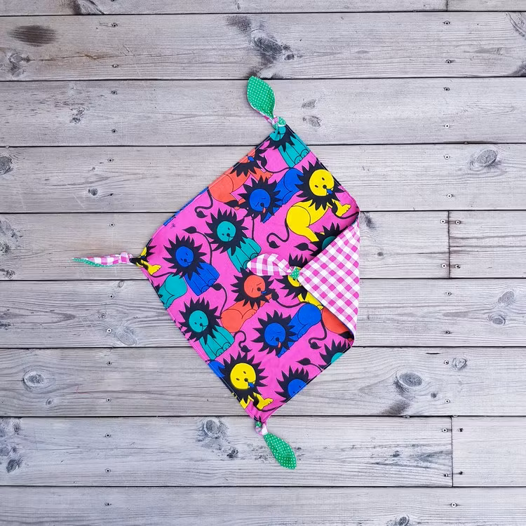 En härligt färgglad snuttefilt med knutar i alla hörnen!