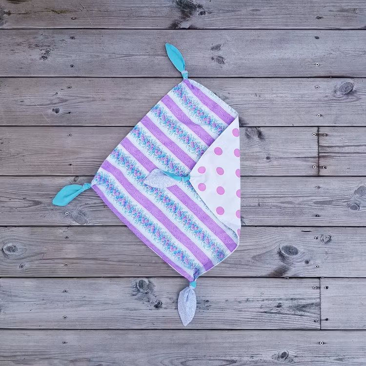 En härligt färgglad snuttefilt med knutar i alla hörnen!