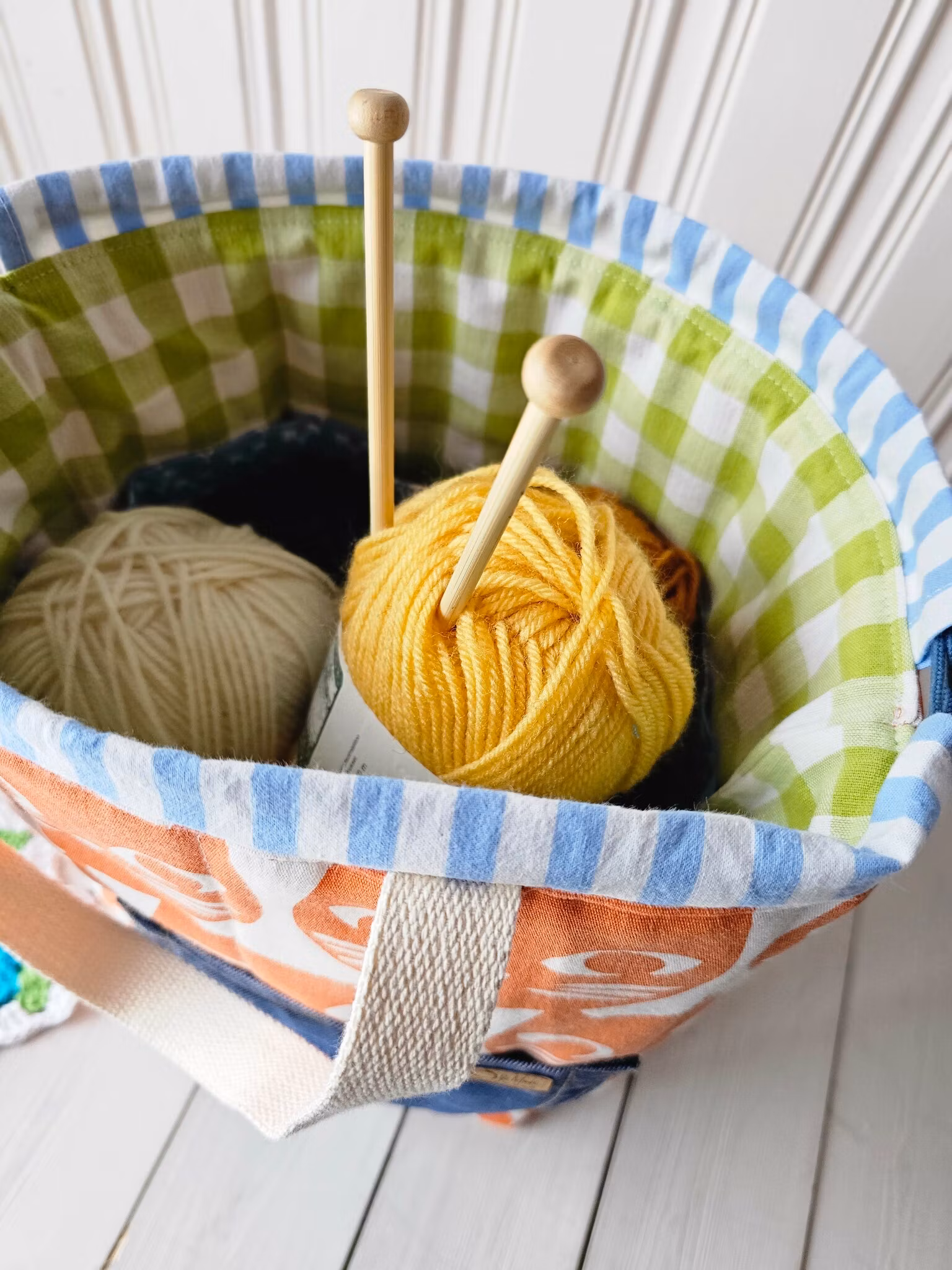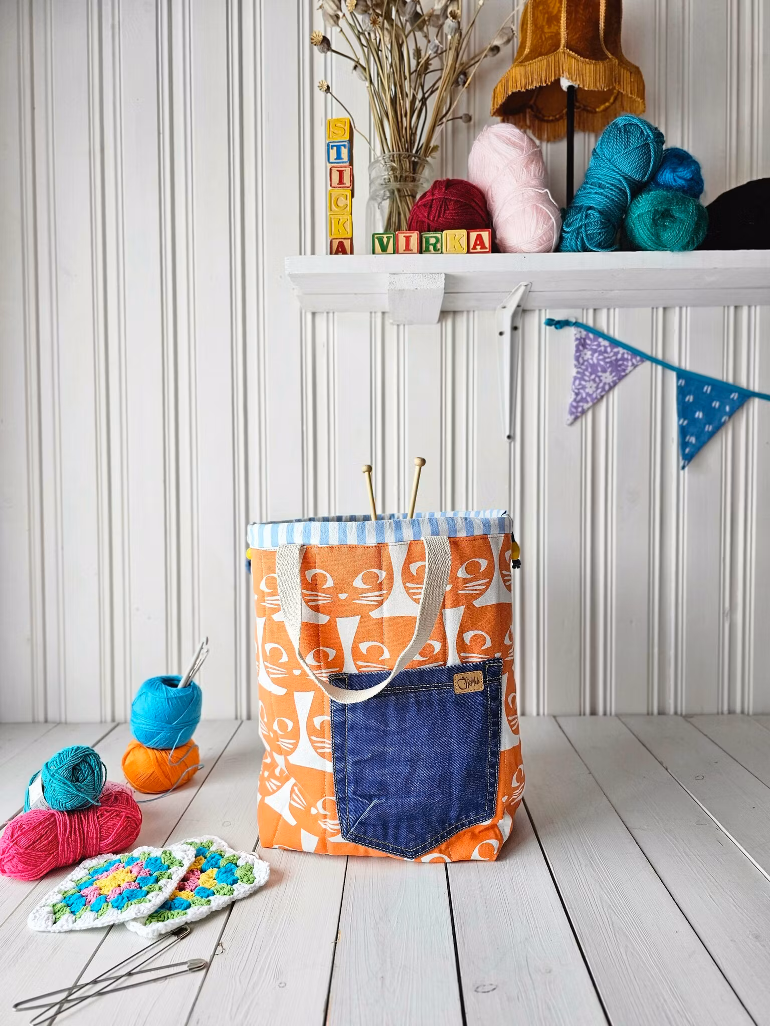 - Organiserad Förvaring: Utrustad med sex praktiska innerfickor i ett kontrasterande tyg, vilket gör det enkelt att hålla ordning på dina stickor, garn och andra handarbets tillbehör.